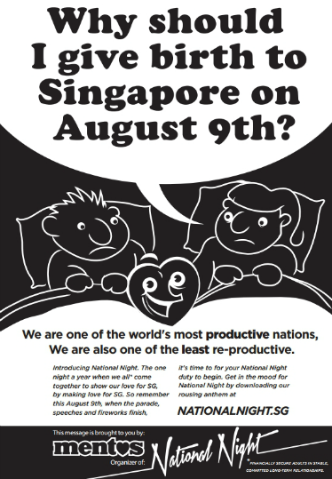 As a contribution toward that end, this year Mentos — yes, the mints brand — decided, ostensibly on its own initiative, to produce an unusual music video for the Singapore market encouraging people to view “National Night” as an occasion for rampant procreation. Their slogan? “This National Night give birth to a nation.” (Technically speaking, of course, unless they’d reached the ends of their pregnancies no one could actually “give birth” on such short notice; at best they could achieve conception. But who’s counting?)